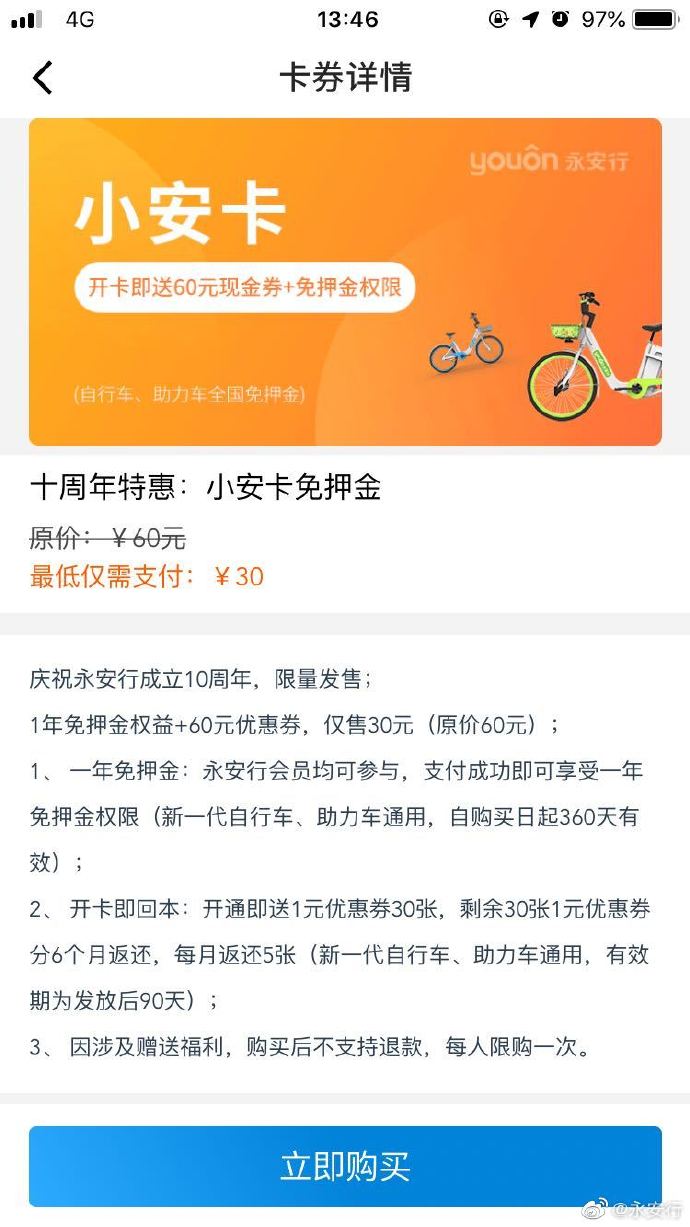 買30元小安卡贈送60元現(xiàn)金券(原價60元)打開永安行app-商城-出行福利進(jìn)行購買#因為永安 出行簡單#