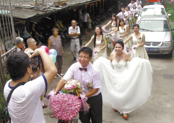 “現(xiàn)在很多新人結(jié)婚,在場面上大都會選用汽車車隊,有條件的家庭更少不了豪車開路??墒俏蚁耄呛痛蠖鄶?shù)人一樣,這么有紀(jì)念意義的一天就會顯得遜色。為了讓我們結(jié)婚當(dāng)天更有意義,也考慮到兩家距離很近,婚前3個月左右,我們就商議并決定用自行車代替汽車,用人力代替油門?!弊蛱煸绯?點30分,劉擎整裝待發(fā)前把他和新娘的迎親創(chuàng)意講給記者聽。他說,這個提議最初遭到了雙方父母的反對,“他們覺得這樣太寒酸,不好看”,多虧了一對新人不停勸說,最后全家才欣然答應(yīng)。