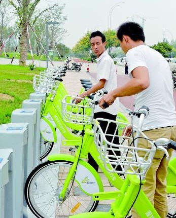山東濰坊市民在人民廣場(chǎng)公共自行車(chē)站點(diǎn)試騎。