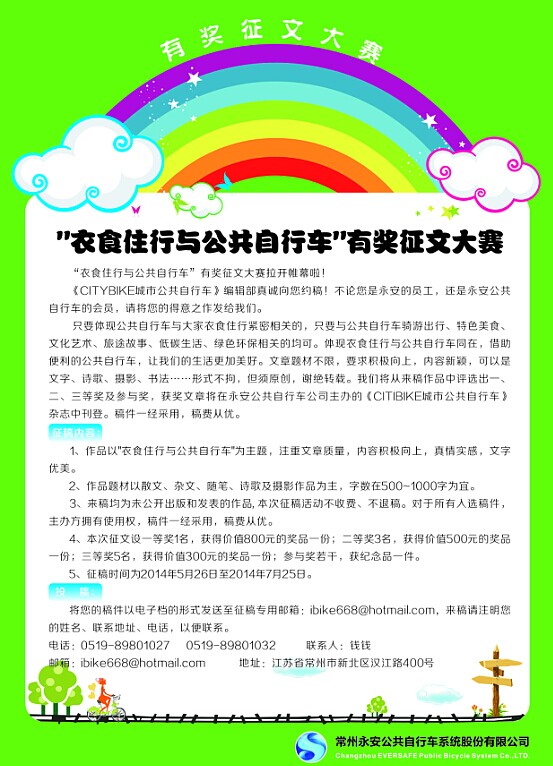 只要體現(xiàn)公共自行車與大家衣食住行緊密相關(guān)的,只要與公共自行車騎游出行、特色美食、文化藝術(shù)、旅途故事、低碳生活、綠色環(huán)保相關(guān)的均可。體現(xiàn)衣食住行與公共自行車同在,借助便利的公共自行車,讓我們的生活更加美好。文章題材不限,要求積極向上,內(nèi)容新穎,可以是文字、詩歌、攝影、書法……形式不拘,但須原創(chuàng),謝絕轉(zhuǎn)載。我們將從來稿作品中評選出一、二、三等獎(jiǎng)及參與獎(jiǎng),獲獎(jiǎng)文章將在永安公共自行車公司主辦的《citibike城市公共自行車》雜志中刊登。稿件一經(jīng)采用,稿費(fèi)從優(yōu)。