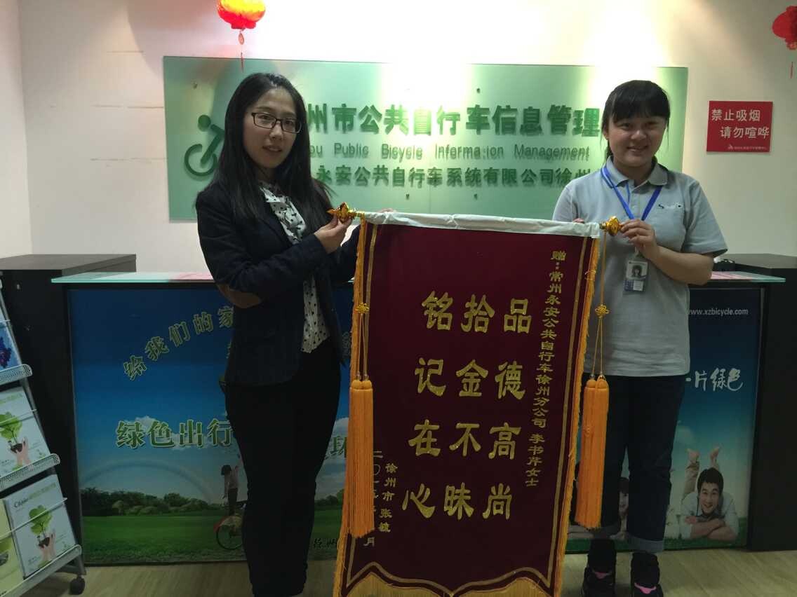 2015年4月23日,徐州市民張女士不小心把筆記本電腦遺落在公共自行車車籃里,我公司員工李書芹巡視站點發(fā)現(xiàn)后立即與失主張女士聯(lián)系,第二天一早將筆記本電腦歸還,張女士當時給予李書芹現(xiàn)金感謝,被李書芹婉拒,張女士為了表示感謝,于昨日到徐州公共自行車信息管理中心給李書芹送來錦旗表示感謝。