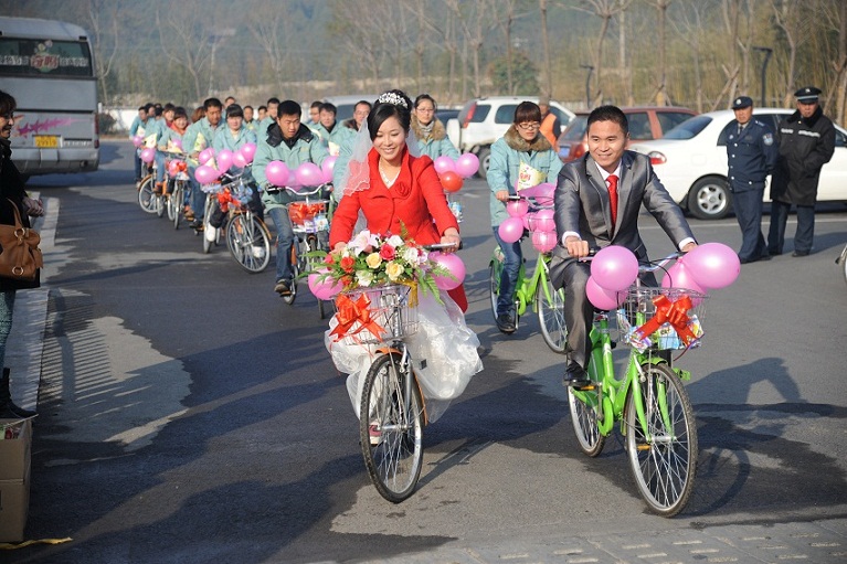 平日里他們就崇尚低碳環(huán)保,當(dāng)公共自行車在徐州市驚艷亮相后,他們便決定用那抹象征生命的蘋果綠和象征熱情的橙紅來見證他們的愛情。