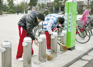 中國(guó)徐州網(wǎng)-都市晨報(bào) 昨日下午,二十六中15名初中生來到九龍湖公共自行車停放點(diǎn)義務(wù)擦車。
