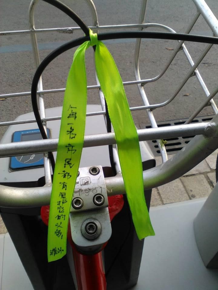 當(dāng)天上午8時許,記者來到東風(fēng)西街與向陽路交叉口以西路南的公共自行車站點,十幾輛公共自行車的車筐位置都綁上了綠絲帶,上面寫著“請自覺愛護自行車”、“自行車也怕疼”等話語,另外還有微笑、哭泣等表情符號,仿佛是公共自行車在跟人對話。記者走訪了周邊的幾個公共自行車站點看到,每個站點都有綁綠絲帶的公共自行車。