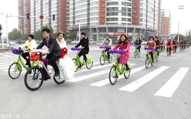 用公共自行車代替?zhèn)鹘y(tǒng)婚車,沒有豪車,沒有奢華的場面,但親友團(tuán)們組成的自行車陣,也賺足了市民的眼球,贏得百分百的回頭率。在高檔婚車“熱”的當(dāng)下,低碳、環(huán)保的公共自行車迎親隊伍猶如雨后一抹新綠,讓人眼前一亮。這種浪漫的結(jié)婚方式讓婚禮變得更有意義。