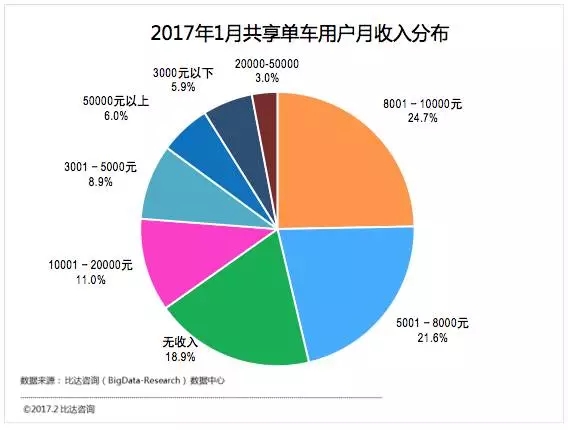 2017年1月共享單車用戶月收入分布方面, 8001元至10000萬占比最多,達(dá)24.7%;5001至8000元占21.6%;無收入人群多為學(xué)生群體,占18.9%。
