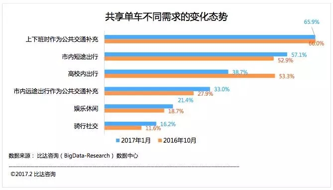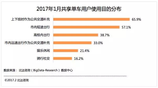 2017年1月共享單車用戶使用目的分布,上下班通勤作為交通補(bǔ)充最多,達(dá)65.9%;市內(nèi)短途出行為57.1%;高校內(nèi)出行38.7%。