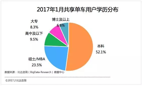 2017年1月共享單車用戶學(xué)歷分布方面,本科占比最多,達(dá)52.1%;碩士/mba占23.5%;高中及以下占9.5%。