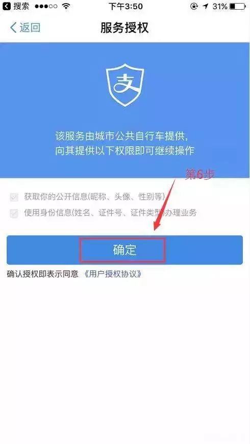 6、因為是首次使用,會出現(xiàn)一個授權(quán)服務(wù),要求公開一定的個人信息,以及使用身份信息辦理這項業(yè)務(wù)。如果沒問題,點擊“確定”就好。