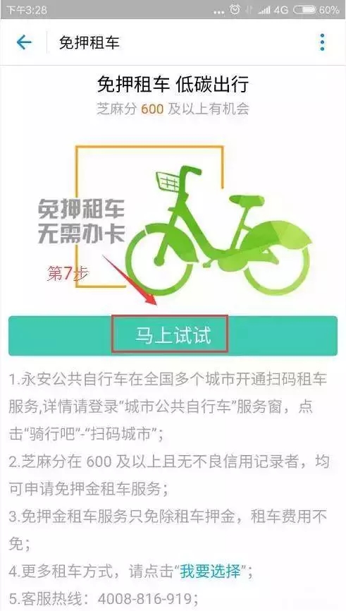 7、果然,芝麻分在600分及以上才可以使用。點擊“馬上試試”,下面就正式進入租車的步驟啦!