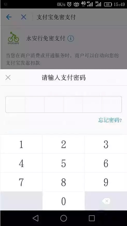 會出現(xiàn)一個設(shè)置支付密碼的界面。這是為了確保超過1小時后,, , 公共自行車向支付寶發(fā)起自動扣費。正常填寫就好。