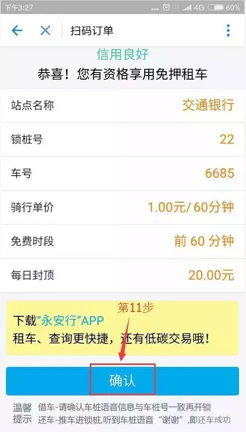 9、填寫好支付密碼后,跳轉(zhuǎn)的界面上,我們可以看到上面有站點名稱、鎖樁號、車號、騎行單價、免費時段以及每日封頂。