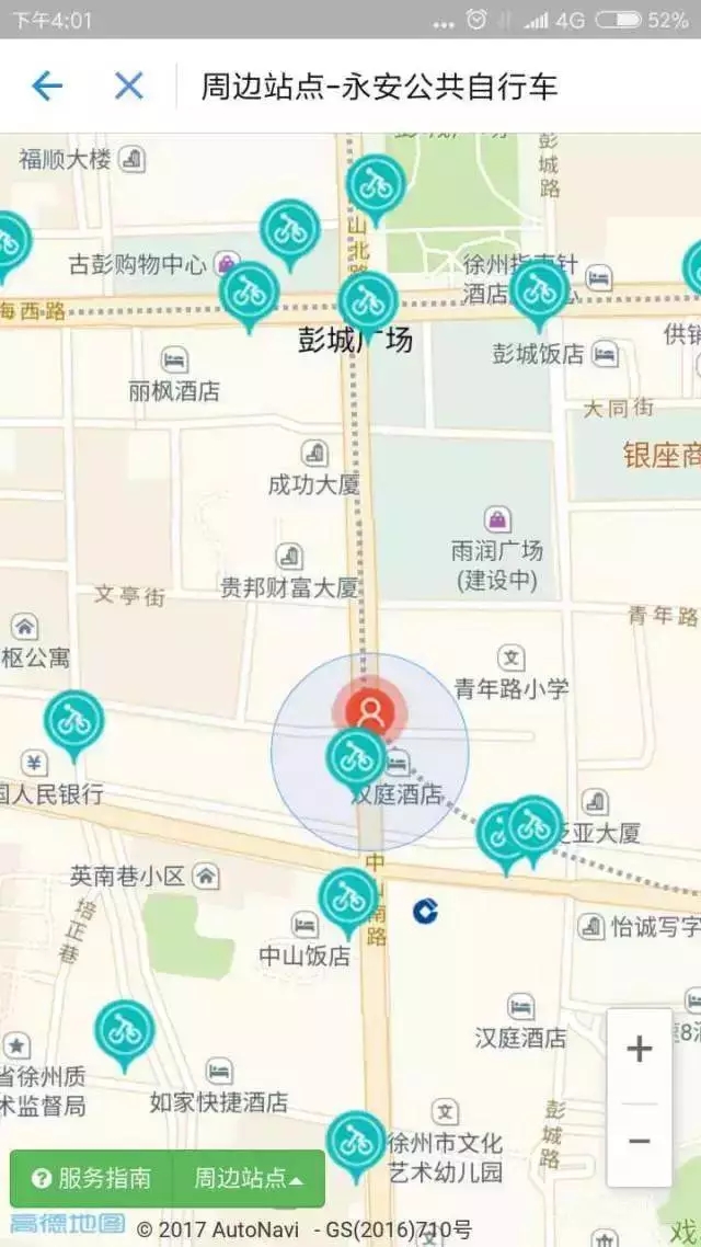 點進去以后,手機自動定位了路人君當(dāng)時所在的位置,并且將周圍公共自行車的站點顯示了出來。