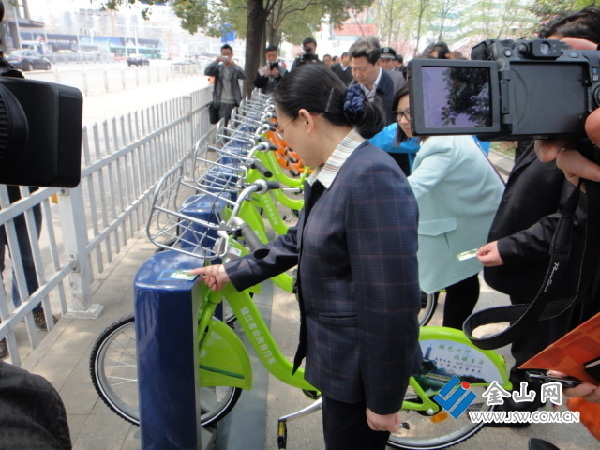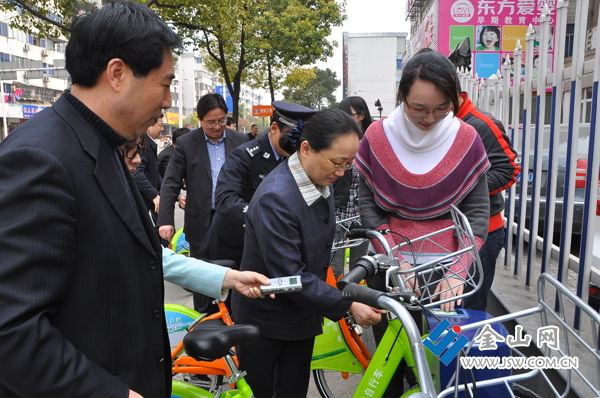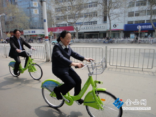 在大市口廣場(chǎng)上,朱曉明、雷志強(qiáng)一行首先閱讀了標(biāo)注有公共自行車使用方法和車位分布圖的展牌。朱曉明要求市城管部門更廣泛地宣傳使用方法和車位分布圖,讓更多市民知曉,并在試運(yùn)行的一個(gè)月中及時(shí)聽取他們的意見和建議,隨時(shí)加以改進(jìn),以便5月1日正式運(yùn)行時(shí)給市民帶去更多方便。隨后,朱曉明、雷志強(qiáng)及有關(guān)部門負(fù)責(zé)人來(lái)到位于房產(chǎn)交易中心外的車位上各自取了一輛自行車騎上了解放路。