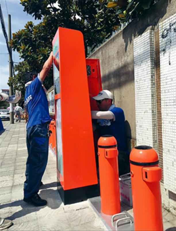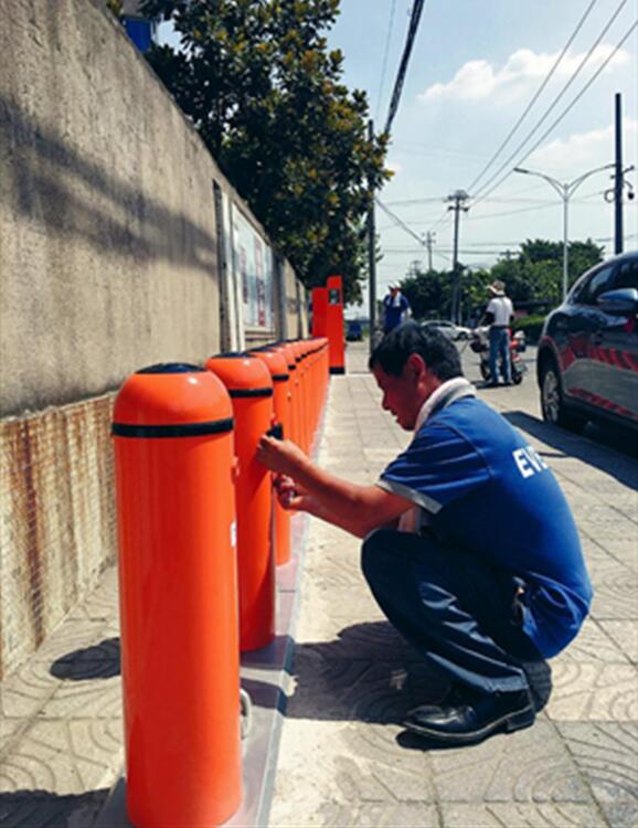 車輛安全卸下后,工人們來到花溪苑一區(qū)門口站點安裝調試新的機柜、鎖柱,并將新車一輛輛上軌,擺放整齊。為了不影響附近居民的使用,工作人員搶時間、戰(zhàn)高溫,基本做到了當天拆當天安裝,在24小時內恢復正常使用。